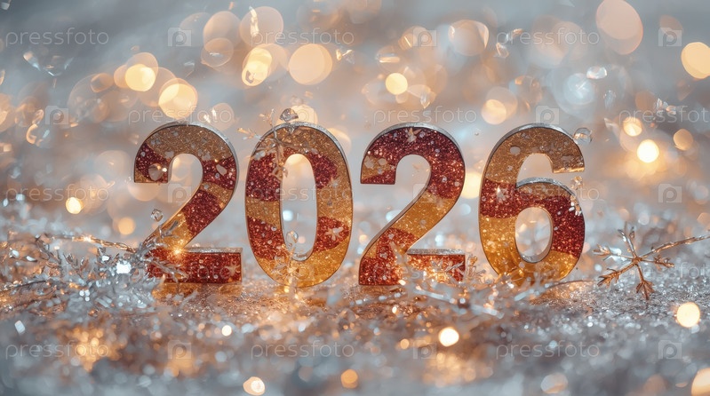 Баннер. блестящие золотые номера 2026 года и красивый боке на красном фоне. с Новым годом и Рождеством