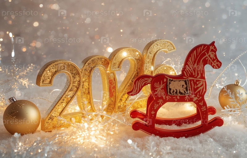 Новогодняя открытка 2026 года с красным огненным конем. Рождественская елка, красная лошадь и фигуры на дереве 2026. украшение интерьера вашего дома в зимние каникулы