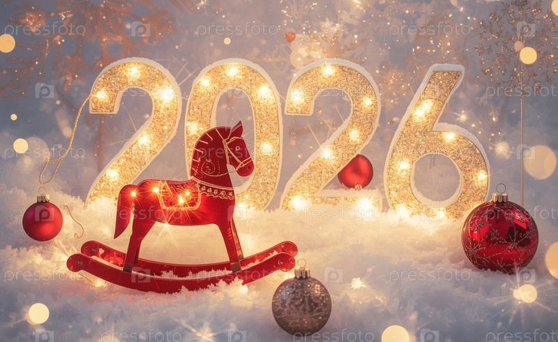 Новогодняя открытка 2026 года с красным огненным конем. Рождественская елка, красная лошадь и фигуры на дереве 2026. украшение интерьера вашего дома в зимние каникулы