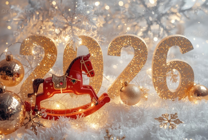 Новогодняя открытка 2026 года с красным огненным конем. Рождественская елка, красная лошадь и фигуры на дереве 2026. украшение интерьера вашего дома в зимние каникулы
