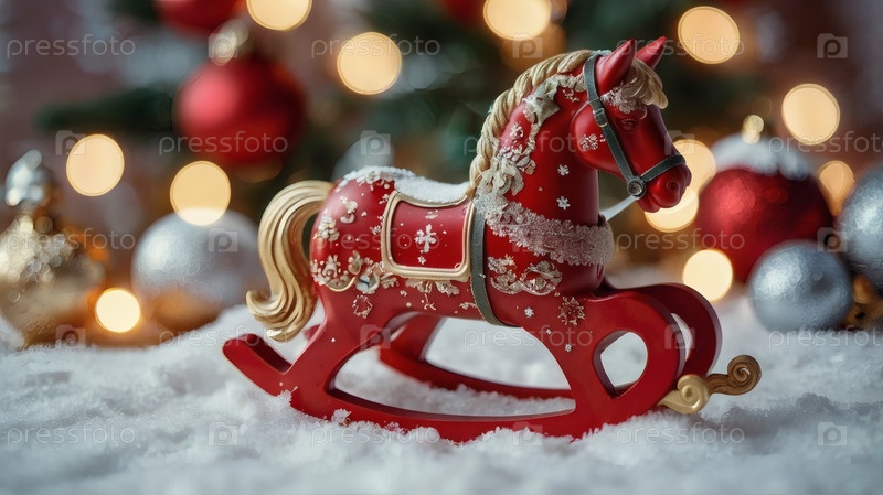 Новогодняя открытка 2026 года с красным огненным конем. Рождественская елка, красная лошадь и фигуры на дереве 2026. украшение интерьера вашего дома в зимние каникулы