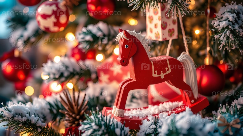 Новогодняя открытка 2026 года с красным огненным конем. Рождественская елка, красная лошадь и фигуры на дереве 2026. украшение интерьера вашего дома в зимние каникулы