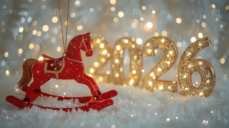 Новогодняя открытка 2026 года с красным огненным конем. Рождественская елка, красная лошадь и фигуры на дереве 2026. украшение интерьера вашего дома в зимние каникулы