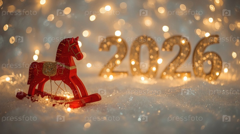 Новогодняя открытка 2026 года с красным огненным конем. Рождественская елка, красная лошадь и фигуры на дереве 2026. украшение интерьера вашего дома в зимние каникулы