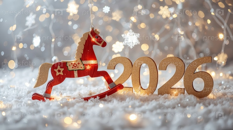 Новогодняя открытка 2026 года с красным огненным конем. Рождественская елка, красная лошадь и фигуры на дереве 2026. украшение интерьера вашего дома в зимние каникулы