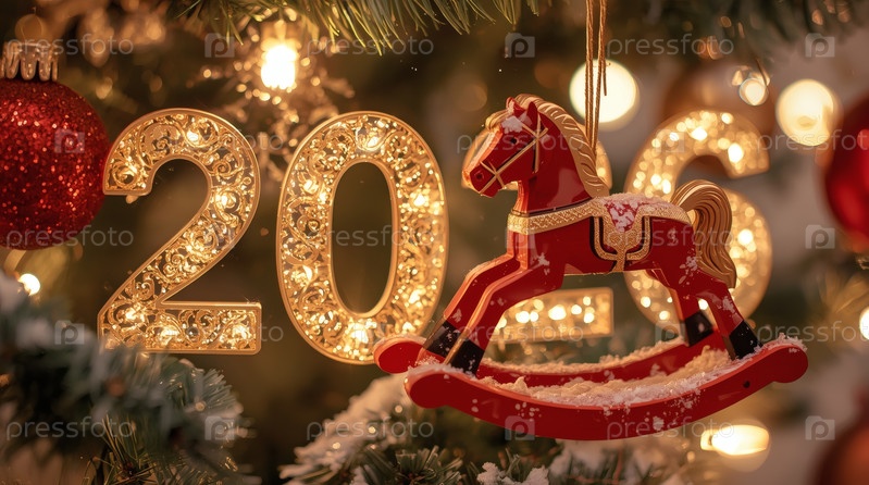 Новогодняя открытка 2026 года с красным огненным конем. Рождественская елка, красная лошадь и фигуры на дереве 2026. украшение интерьера вашего дома в зимние каникулы