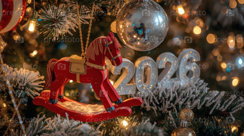 Новогодняя открытка 2026 года с красным огненным конем. Рождественская елка, красная лошадь и фигуры на дереве 2026. украшение интерьера вашего дома в зимние каникулы