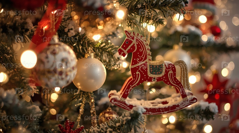 Новогодняя открытка 2026 года с красным огненным конем. Рождественская елка, красная лошадь и фигуры на дереве 2026. украшение интерьера вашего дома в зимние каникулы