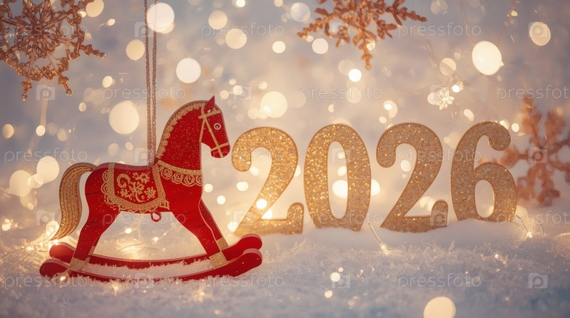 Новогодняя открытка 2026 года с красным огненным конем. Рождественская елка, красная лошадь и фигуры на дереве 2026. украшение интерьера вашего дома в зимние каникулы