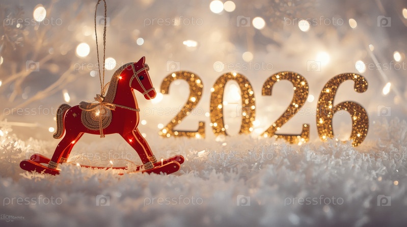 Новогодняя открытка 2026 года с красным огненным конем. Рождественская елка, красная лошадь и фигуры на дереве 2026. украшение интерьера вашего дома в зимние каникулы