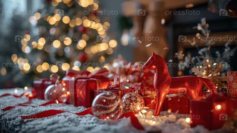 Новогодняя открытка 2026 года с красным огненным конем. Рождественская елка, красная лошадь и фигуры на дереве 2026. украшение интерьера вашего дома в зимние каникулы