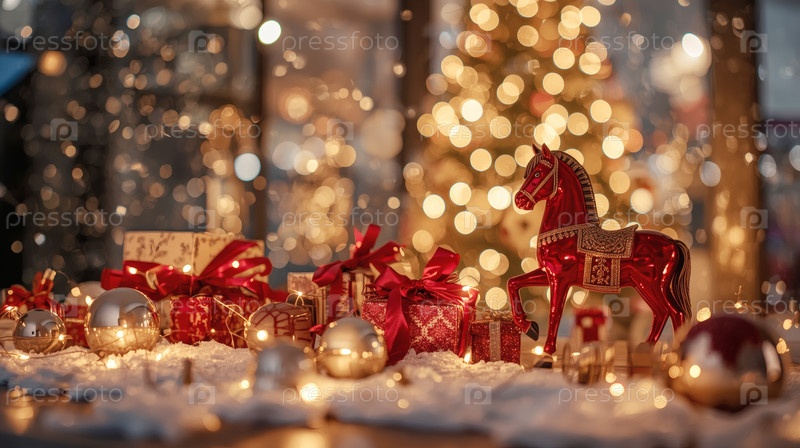 Новогодняя открытка 2026 года с красным огненным конем. Рождественская елка, красная лошадь и фигуры на дереве 2026. украшение интерьера вашего дома в зимние каникулы