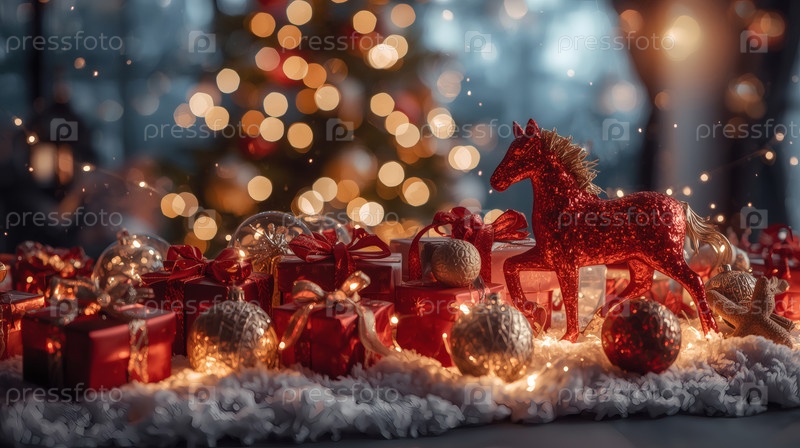 Новогодняя открытка 2026 года с красным огненным конем. Рождественская елка, красная лошадь и фигуры на дереве 2026. украшение интерьера вашего дома в зимние каникулы