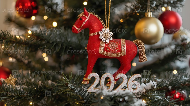 Новогодняя открытка 2026 года с красным огненным конем. Рождественская елка, красная лошадь и фигуры на дереве 2026. украшение интерьера вашего дома в зимние каникулы