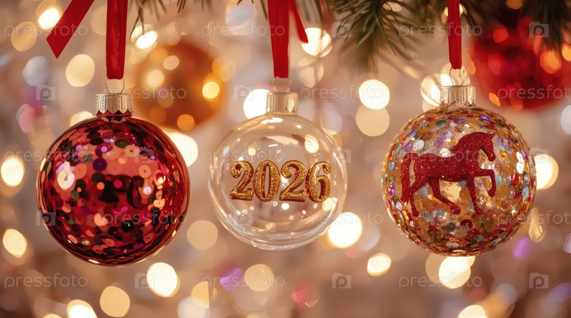 Прекрасный рождественский фон, баннер из висящего стекла Рождественские шары и коневые подвески