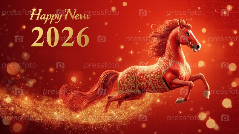 Китайский гороскоп. С Новым годом 2026. Символ года - красный огненный конь на красном фоне. Баннер для вечеринки и новогодней ночи