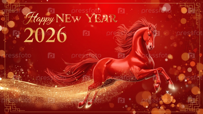 Китайский гороскоп. С Новым годом 2026. Символ года - красный огненный конь на красном фоне. Баннер для вечеринки и новогодней ночи