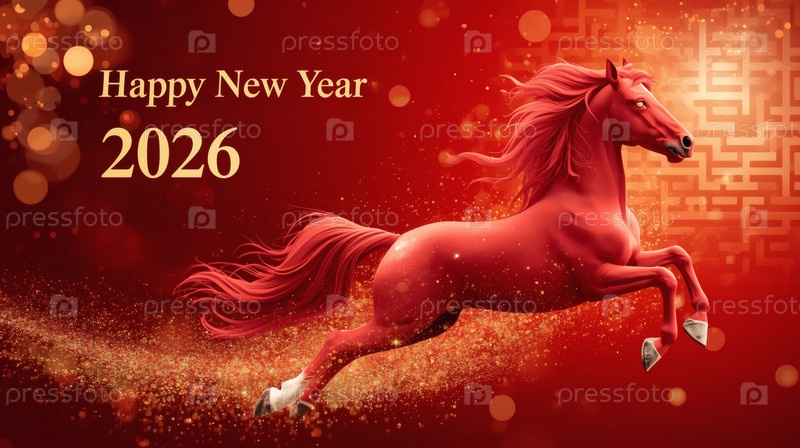 Китайский гороскоп. С Новым годом 2026. Символ года - красный огненный конь на красном фоне. Баннер для вечеринки и новогодней ночи