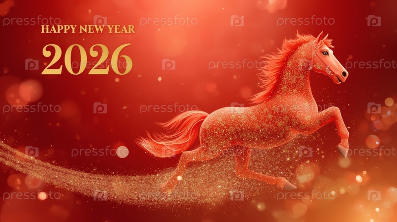 Китайский гороскоп. С Новым годом 2026. Символ года - красный огненный конь на красном фоне. Баннер для вечеринки и новогодней ночи