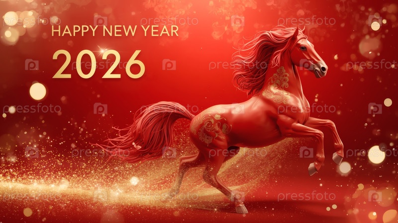 Китайский гороскоп. С Новым годом 2026. Символ года - красный огненный конь на красном фоне. Баннер для вечеринки и новогодней ночи