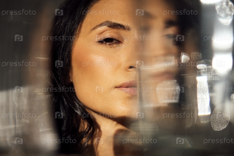 Портрет женщины с темными волосами, показывающий ее черты лица через зеркальные отражения, создавая художественную и интригующую визуальную атмосферу