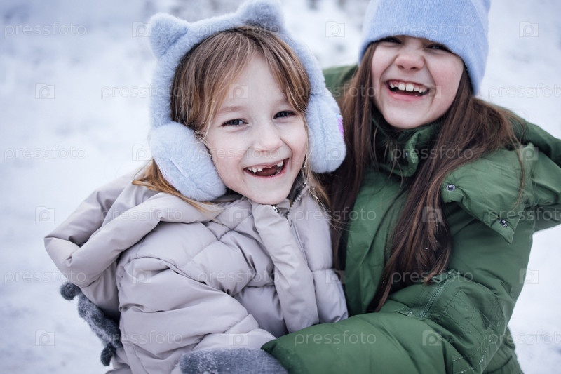 Две радостные девушки, одна в уютном розовом куртке, а другая - в зеленом пальто, смеются вместе в снежном пейзаже, захватывая суть зимнего веселья и дружбы