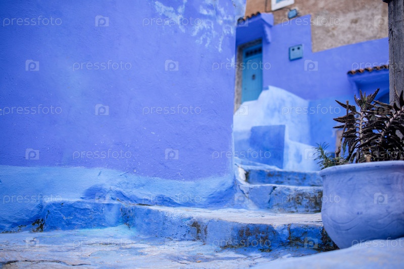 Ярко-синяя аллея с текстурированными стенами и каменными ступеньками, украшенная горшковыми растениями, создает спокойную атмосферу в очаровательной городской обстановке с художественным талантом