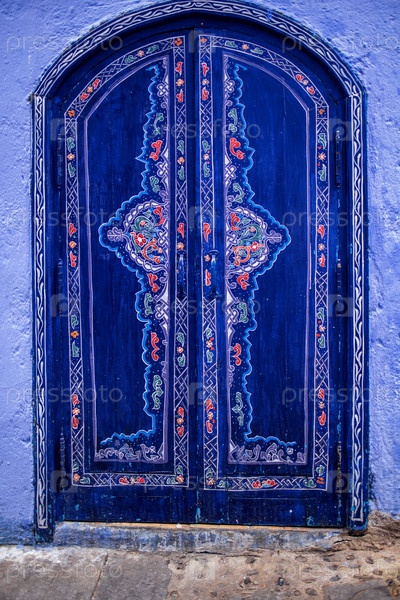 Декорированная голубая деревянная дверь со сложными красочными узорами, обрамленная текстурированной фиолетовой стеной, демонстрирует традиционное мастерство и культурные способности в архитектурном дизайне