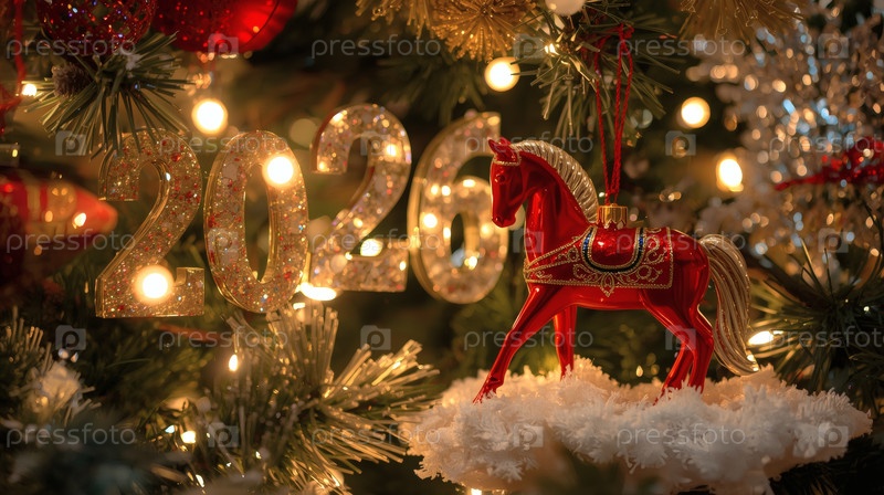 Новогодняя открытка 2026 года с красным огненным конем. Рождественская елка, красная лошадь и фигуры на дереве 2026. украшение интерьера вашего дома в зимние каникулы