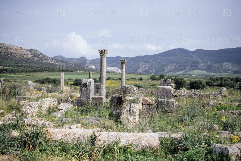 Древние руины с выветрившимися каменными колоннами и разбросанными останками, окруженные пышной зеленой травой и далекими горами, демонстрируют историческую архитектуру и природную красоту