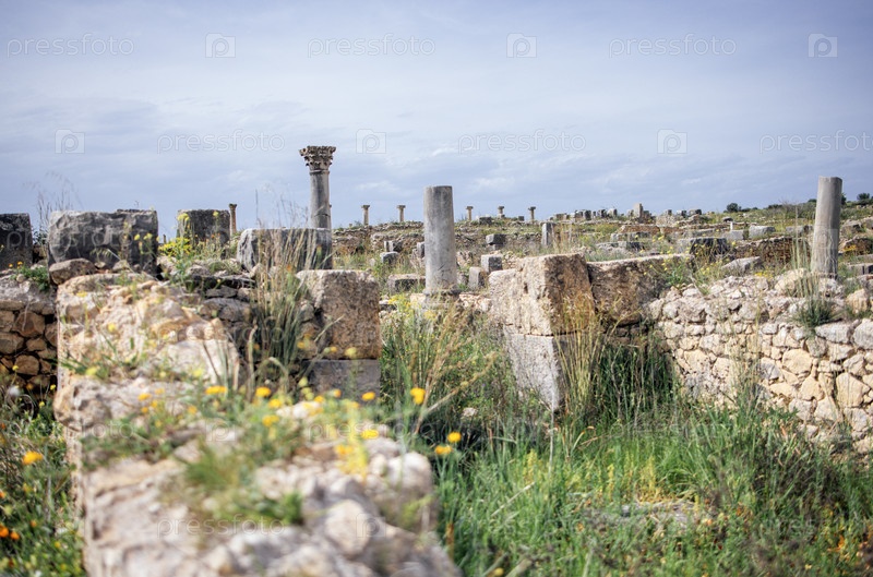 Древние руины с каменными сооружениями и колоннами, заросшими дикими цветами, демонстрируют красоту исторической архитектуры и естественного воспроизводства в спокойном ландшафте