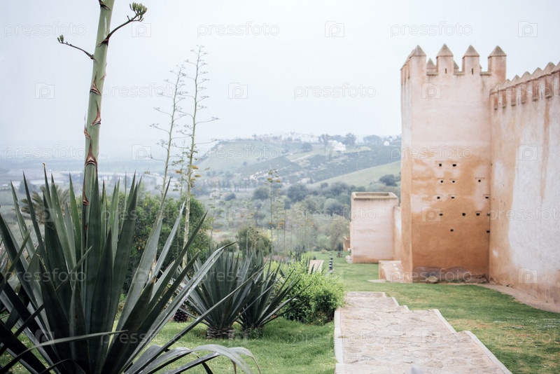 Живописный вид на историческую стену крепости, окруженную пышной зеленью и пустынными растениями, с холмами на заднем плане, создавая спокойную атмосферу в природе