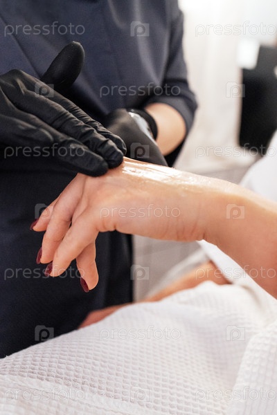Женщина-эстетик в черных перчатках наносит успокаивающее лечение на руку клиента, демонстрируя расслабляющую спа среду с мягкими текстурами и умиротворяющей атмосферой
