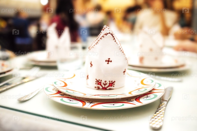 Элегантный стол с сложными складывающимися белыми салфетками на декоративных тарелках, окруженные столовыми приборами, создавая изысканную обстановку в ресторане для особых случаев