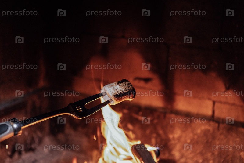 Маршмелоу на жареном вилке обжаряют над ярким костром, с светящимися пламенями и теплыми углими, создавая уютную атмосферу снаружи для коллекционирования