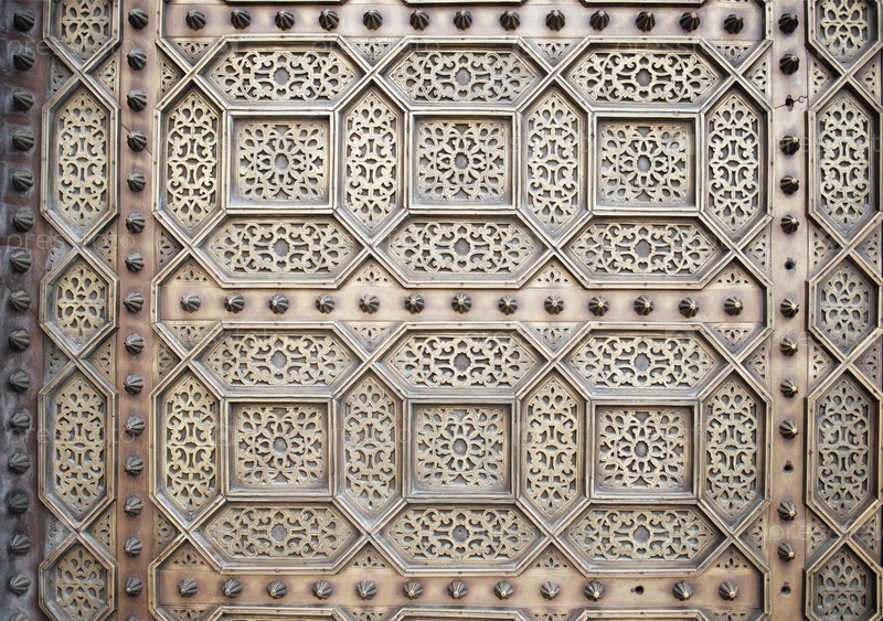 Декоративная металлическая дверь со сложными геометрическими узорами и декоративными элементами, демонстрирующая мастерство и искусство в архитектурном дизайне, идеально подходит для культурных и исторических тем