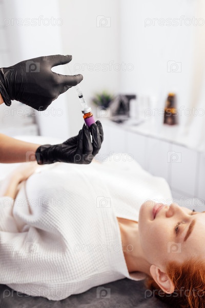Женщина-эстетик в черных перчатках готовит шприц для лечения красоты на расслабленной женщине в спа, демонстрируя практику ухода за кожей и оздоровления