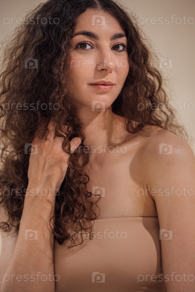 Красивая женщина с длинными кудрявыми волосами грациозно позирует на нейтральном фоне, демонстрируя естественную красоту и элегантность в мягкой спокойной атмосфере с акцентом на самовыражение