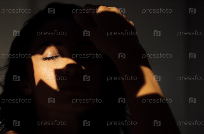Женщина с закрытыми глазами, освещенная мягким светом и тенями, нежно прикасаясь к ее лбу, создавая спокойную атмосферу интроспекции и спокойствия в минималистической обстановке