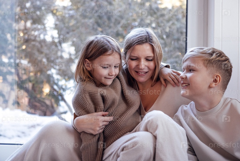 Мать с двумя детьми сидят вместе у окна, наслаждаясь уютным моментом в помещении, окруженными мягкими одеялами и спокойным зимним пейзажем снаружи, захватывая тепло и семейную связь