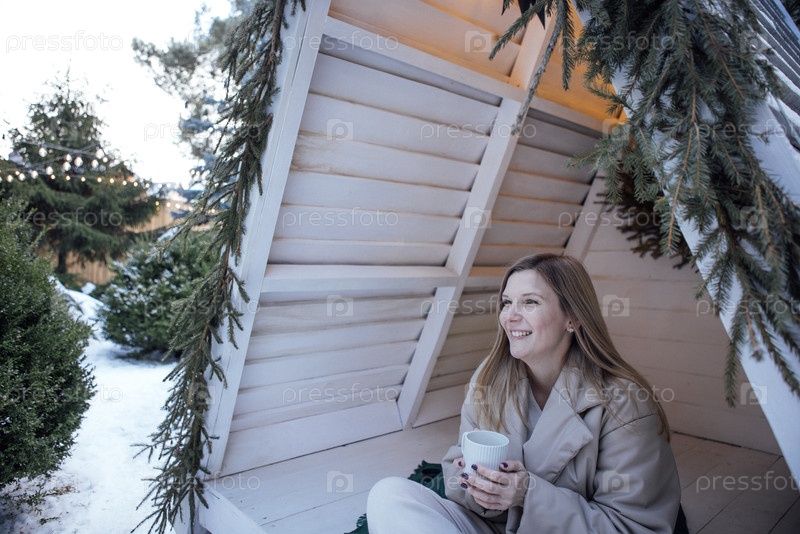 Улыбающаяся женщина с длинными волосами, одетая в уютное пальто, сидит в деревянном укрытии вокруг снега и зелени, наслаждаясь теплым напитком в зимней атмосфере Страны чудес