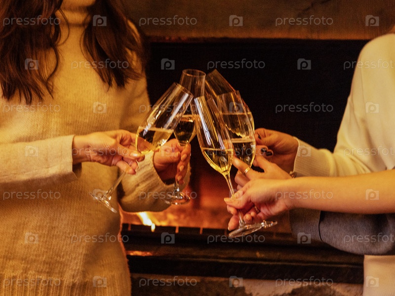 Группа женщин празднует со стаканами игривого шампанского перед уютным камином, создавая теплую и праздничную атмосферу для радостного собрания