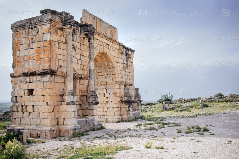 Древние каменные руины арки величественно стоят на фоне облачного неба, окруженного травянистой местностью, демонстрируя историческую архитектуру и остатки прошлой эпохи