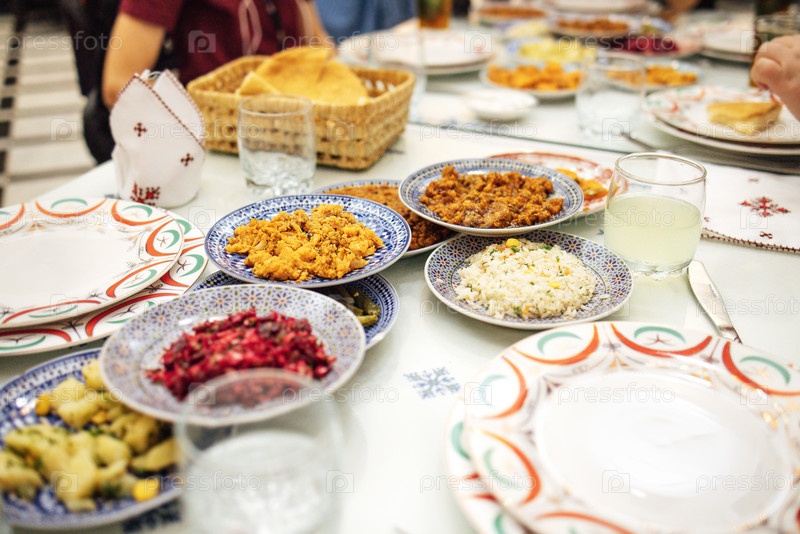 Красочный ассортимент традиционных блюд, подаваемых на рисунковых тарелках с различными текстурами и вкусами, создает яркий ресторанный опыт в привлекательной атмосфере