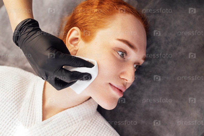 Женщина с рыжими волосами, получающая лечение лица в спа-салоне с профессиональным уходом за кожей, демонстрируя расслабление и самообслуживание в спокойной обстановке