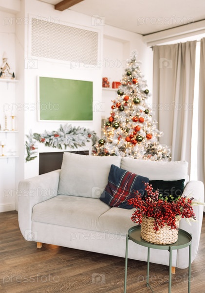 Уютная гостиная с светло-серым диваном, украшенным шаровой подушкой, праздничной рождественской елкой, украшенной орнаментами и стильной корзиной красных ягод