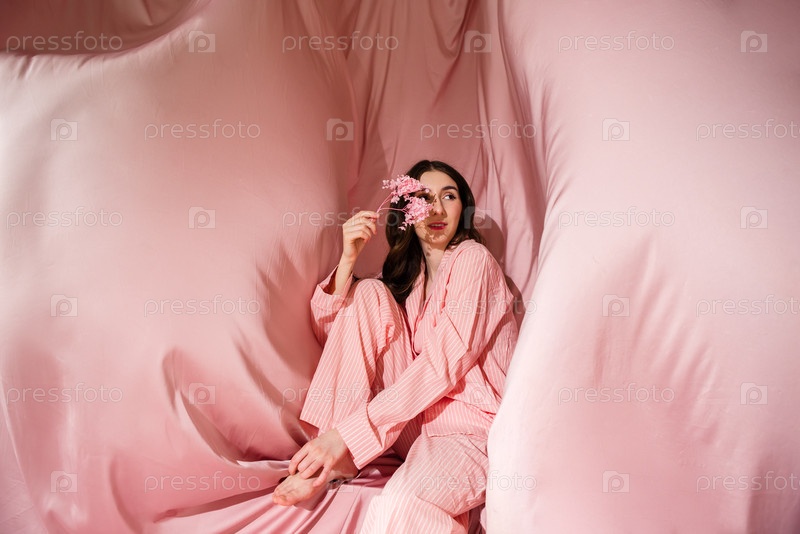 Молодая женщина с длинными темными волосами, в розовой пижаме, сидящая на мягкой розовой ткани, держа цветок, создавая спокойную и мечтательную атмосферу в уютной атмосфере