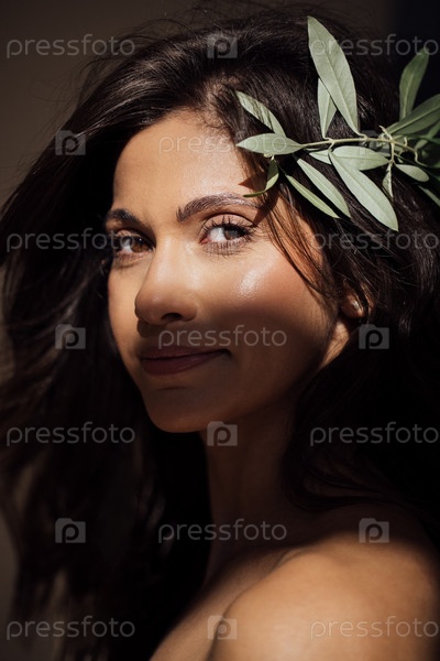 Красивая женщина с длинными темными волосами, украшенными зелеными листьями, вдумчиво смотрит на камеру, демонстрируя естественную красоту и спокойное выражение лица при мягком освещении