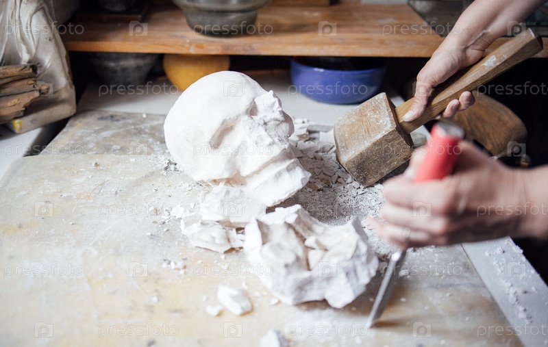 Скульптор, формирующий гипсовый череп с помощью молотка и дюзеля, в окружении инструментов и материалов, демонстрирующих мастерство и навыки создания скульптуры