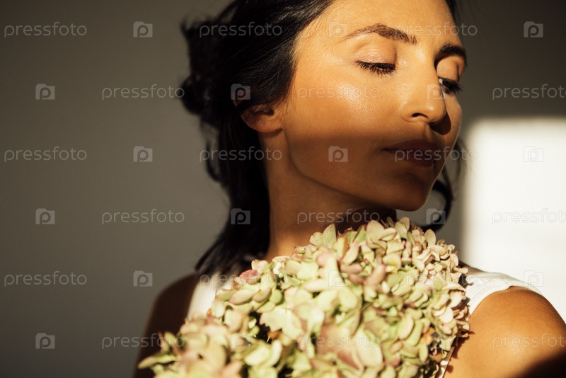 Женщина с темными волосами нежно держит букет мягких зеленых цветов, освещенных теплым солнечным светом, создавая спокойную и тихую атмосферу с естественной красотой